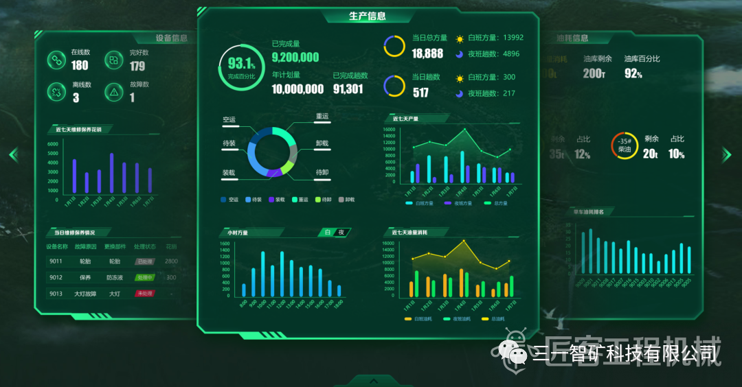 ► 三一智矿践行“绿色矿山”核心理念,积极布局应用纯电、换电、氢燃料等新能源技术的挖掘机、装载机等设备;同时利用矿区天然优势建立光伏发电站,可直接用于电动矿车等设备,形成高效低成本的新能源闭环应用,真正实现绿色,智能的“自给自足”。智矿未来还将引入更多新能源技术,提高矿山开采过程中的能量再生与循环利用,将建设“能量生态链”也作为智慧矿山建设的重要一环。