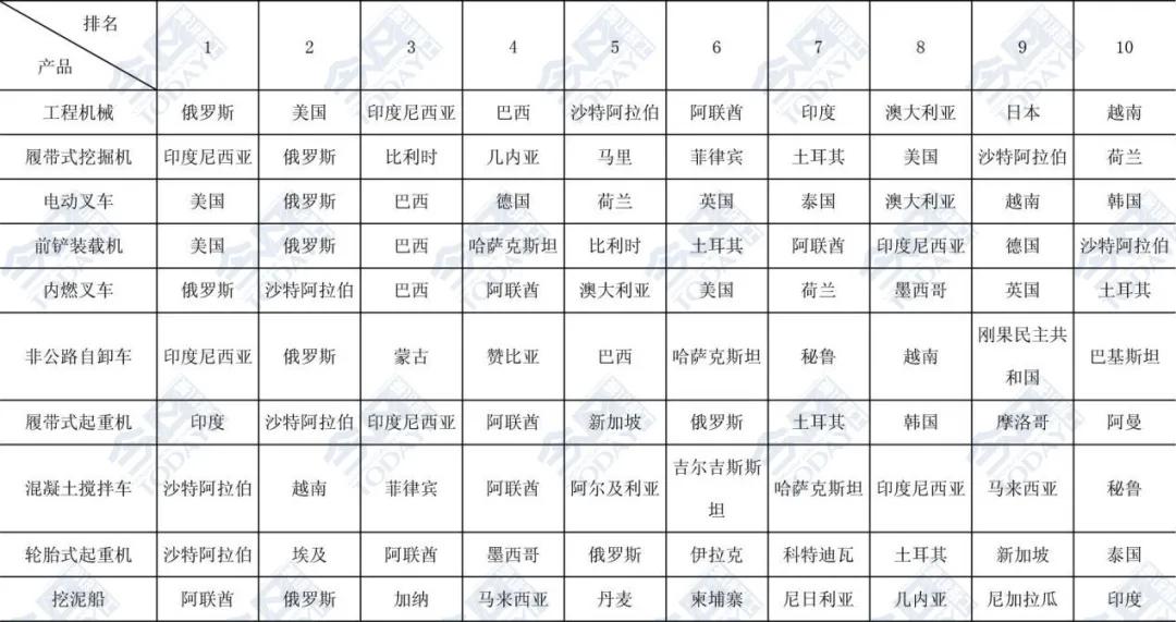 表1 2025年1-9月主要工程机械产品出口金额排名前十位国家和地区