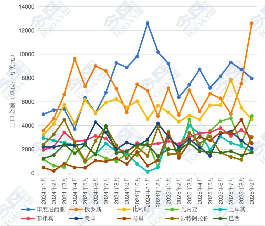 2025年1—9月我国挖掘机累计出口总额达76.36亿美元,相较于2024年同期的60.14亿美元,增长26.96%,增速较1—8月增长1.8个百分点。对印度尼西亚、俄罗斯和比利时出口位列前三。我国挖掘机出口月度走势具体情况如图2所示。