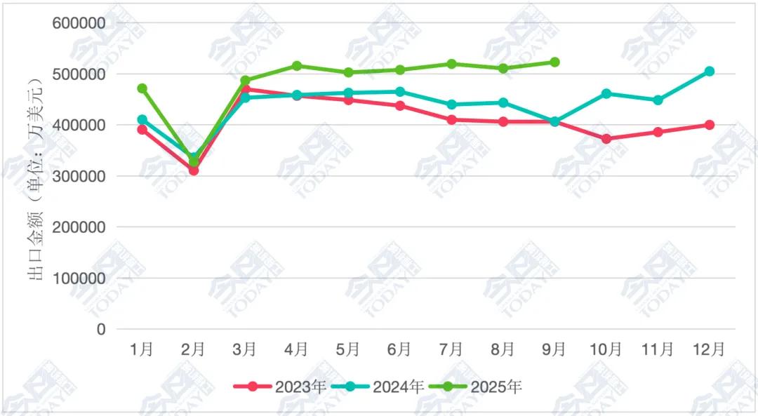 按照以人民币计价的出口额计算,9月份出口额375.82亿元,同比增长29.8%。1至9月累计出口额3145.92亿元,同比增长14.3%。
