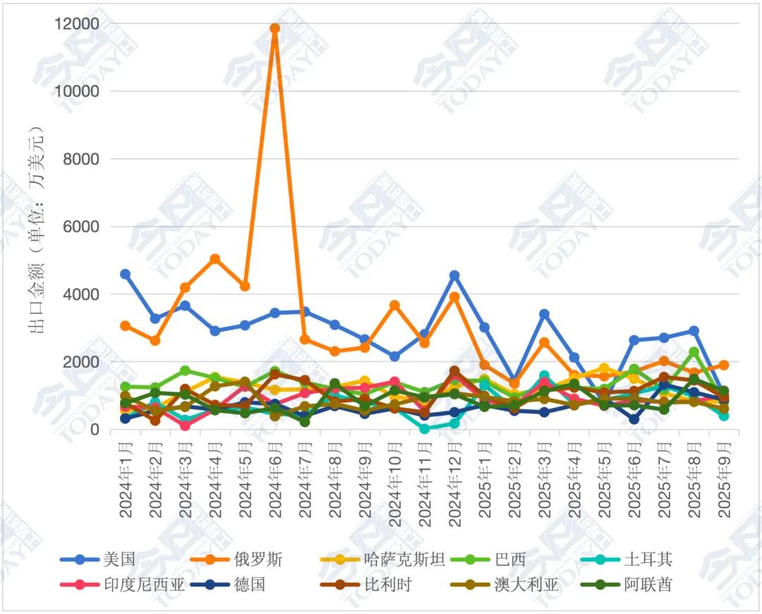 2025年1—9月,我国装载机累计出口总额达28.01亿美元,相较于2024年同期25.84亿美元,同比增长8.39%,增速较1—8月增长0.8个百分点。对美国、俄罗斯和巴西出口位列前三。我国装载机出口月度走势具体情况如图4所示。