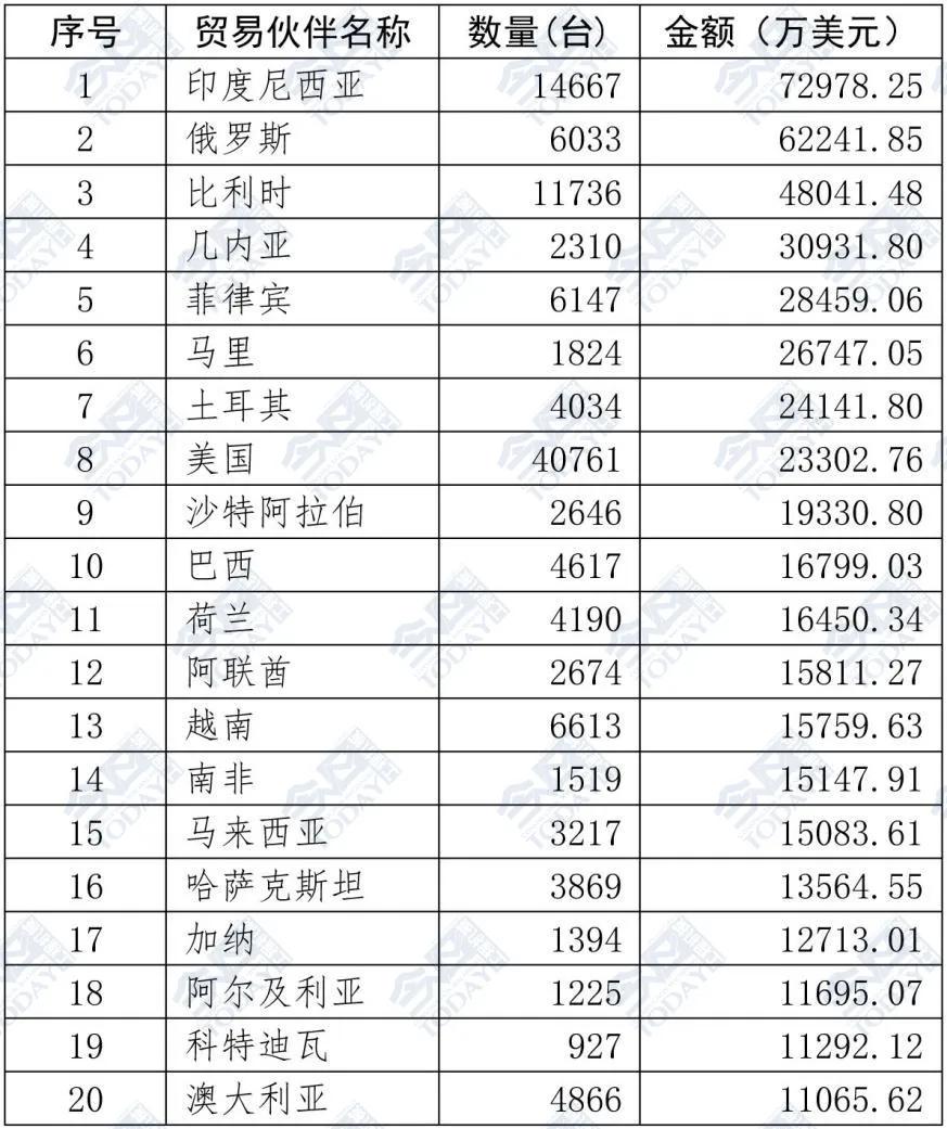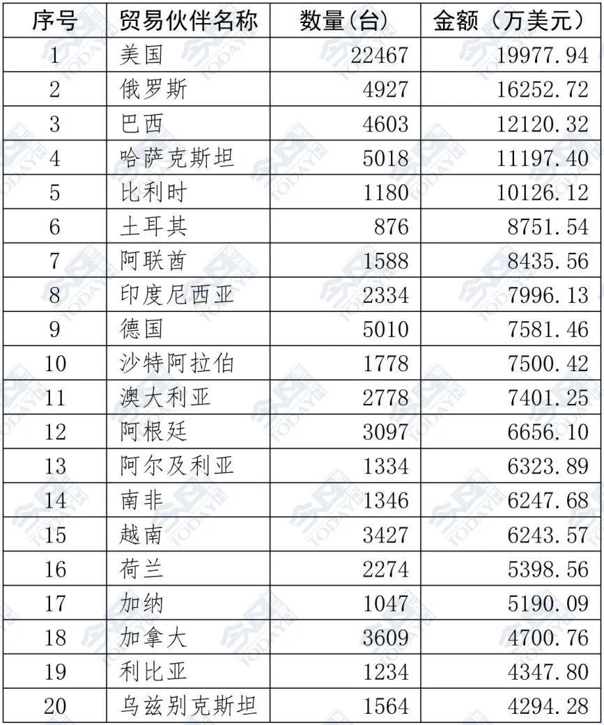 表2 2025年1—9月挖掘机出口额排名前二十位国家和地区