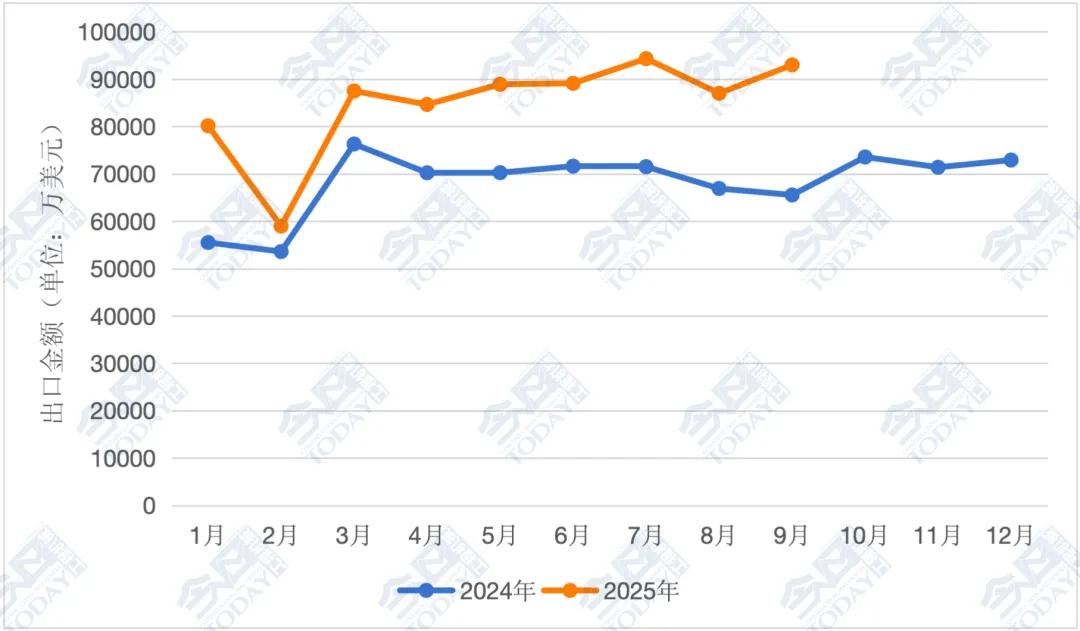 从环比情况来看,9月我国挖掘机出口情况整体呈上升趋势。2025年9月我国挖掘机(含履带挖掘机和轮式挖掘机)出口总额达9.30亿美元,较8月的8.70亿美元上升6.90%。2025年9月较2024年同期的6.55亿美元同比增长41.90%。