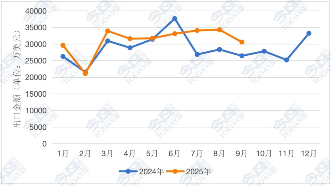 2025年9月,我国装载机出口总额为3.06亿美元,较8月的3.43亿美元下降10.87%,较2024年同期2.65亿美元同比增长15.61%。