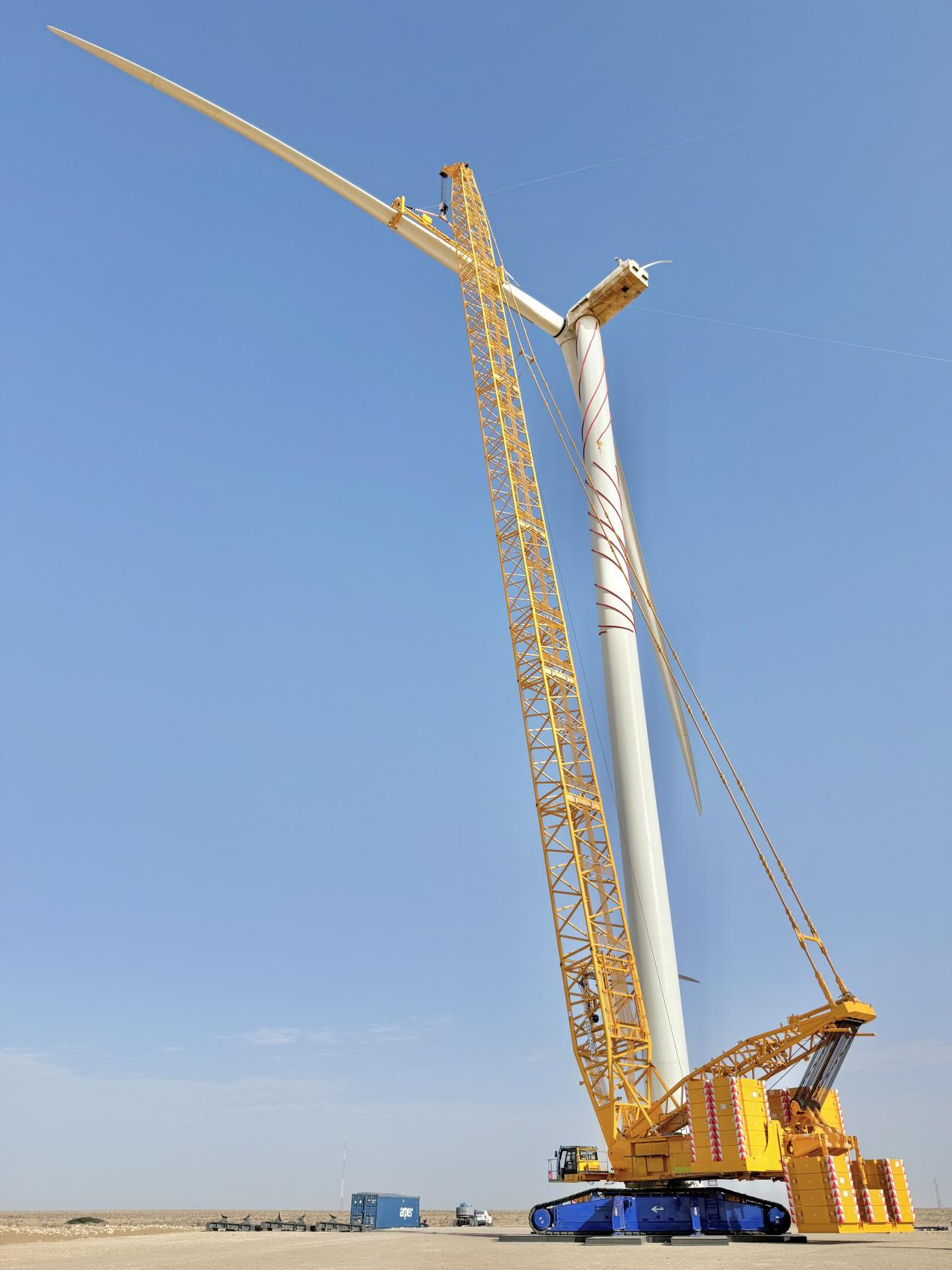 值得一提的是,针对北非干燥多风、地形复杂等特殊工况,这些设备专门进行了优化设计,包括定制化的抗风载结构、高温适应性配置和专用履带系统,有效克服各项挑战,使整体作业效率提升15%,显著减少了风电场停机时间。现场项目负责人表示:“中国装备的专业适配性与智能性能超出预期,为大型风机维护检修树立新标准。”