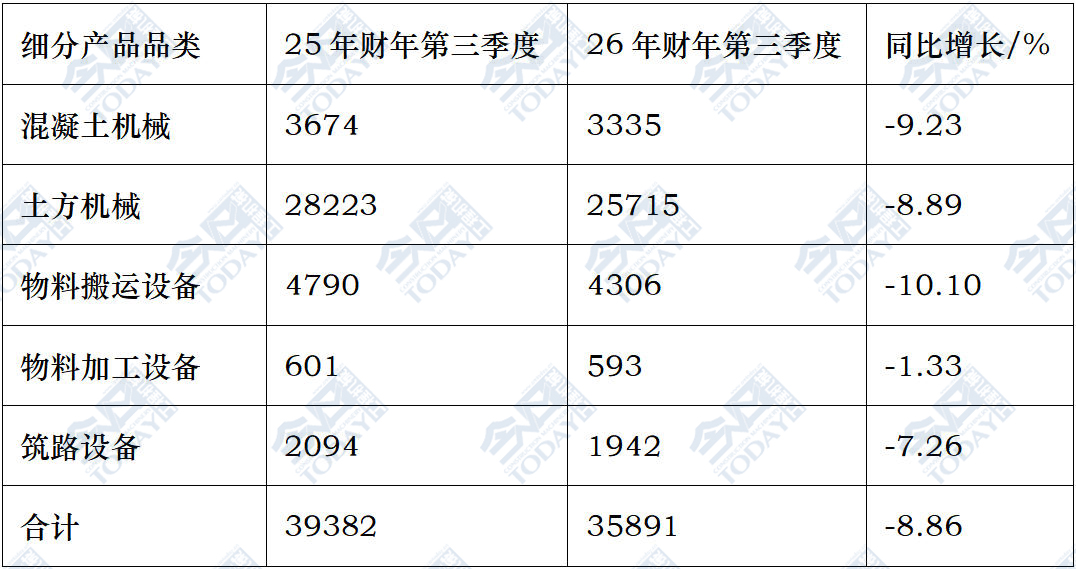 表1 2026年财年第三季度与上年同期各工程机械细分品类销量情况