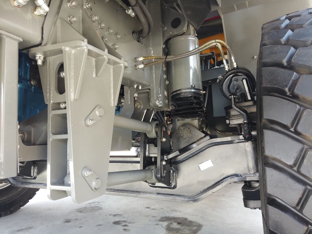 前悬架采用五连杆-非独立式油气悬架,200/170-230大缸径油缸,大大提高前悬架的承载能力,显著降低板簧故障率,提高可靠性。