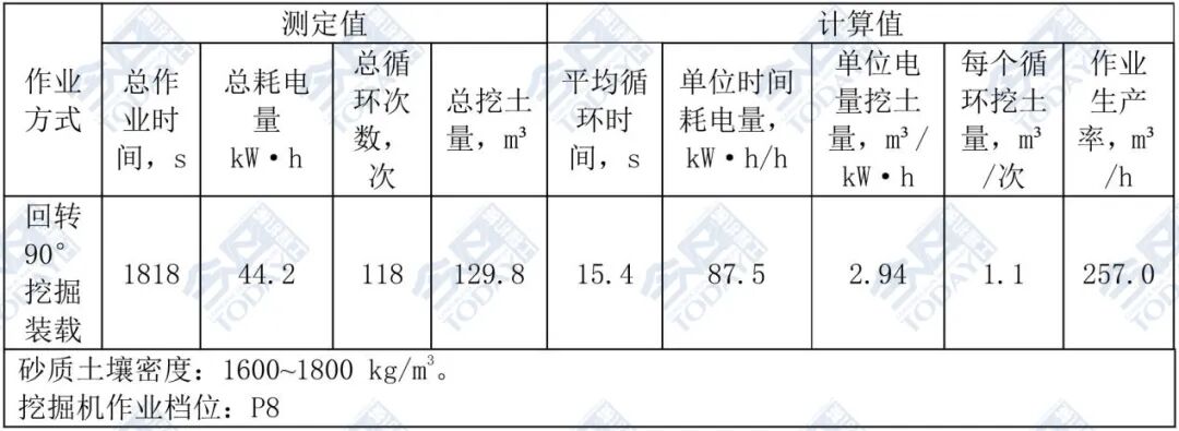 作业效率试验结果:本次测试的作业方式是回转90°挖掘装载。根据规定时间内(30min)挖掘装载作业工况测得总作业时间、总耗电量、总循环次数和总挖土量的数据,计算出平均循环时间为15.4s,单位时间耗电量为87.5 kW·h,单位电量(1kW·h)挖土量为2.94 m³,每个循环挖土量为1.1 m³/次,最终计算得出的作业生产效率为:257.0 m³/h。详情见表1。