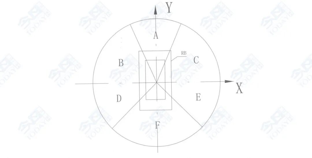 依据标准对视野测试分为两个测试区域:第一个测试区域为挖掘机周边1~1.2米的矩形RB测试区域;第二个测试区域为以挖掘机驾驶室为中心、设备周边12米的圆形测试区域,该测试区分为ABCDEF 6个部分,最终经过对RB区域与ABCDEF 7个测试区域的遮影结果进行汇总,得到该台样机的视野测试结果。视野测试示意见图3。