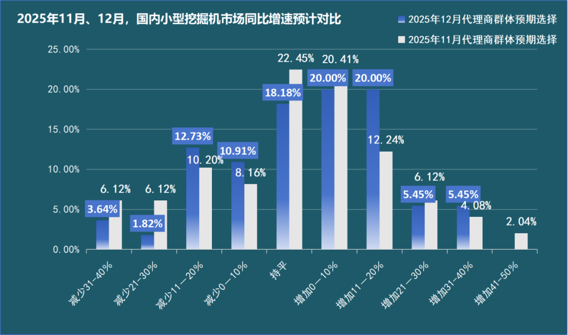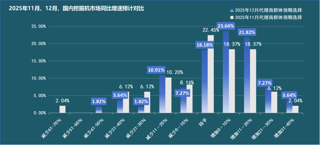 2025年12月,国内市场预期进一步改善,持乐观预期的被调研代理商占比继今年4月之后再次超过五成,与此同时,持悲观预期的代理商降至三成以下。此外,本月并无代理商预计12月挖掘机市场同比增速降低50%以上或者增加40%以上,可见随着市场进一步趋稳,各区域表现出的两级分化程度减弱。