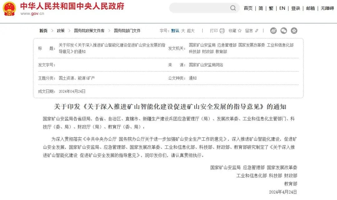 真正的拐点出现在2024年4月。国家矿山安监局等七部委联合印发《关于深入推进矿山智能化建设促进矿山安全发展的指导意见》,明确提出一系列硬性指标:到2026年,全国煤矿智能化产能占比不低于60%,煤矿、非煤矿山危险繁重岗位作业智能装备或机器人替代率分别不低于30%、20%,全国矿山井下人员减少10%以上。此外,《关于进一步加快煤矿智能化建设促进煤炭高质量发展的通知》等文件也持续加码。
